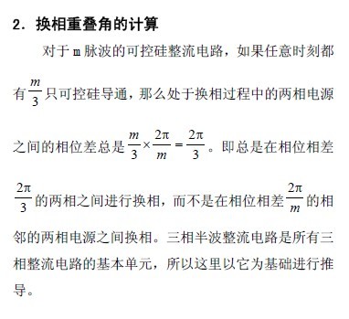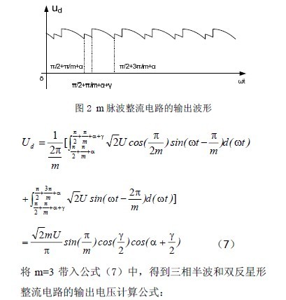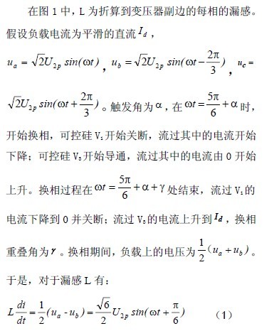 在帶有整流變壓器的可控硅整流電路中,整流變壓器的阻抗是一個(gè)很重要的參數(shù)。整流變壓器的阻抗導(dǎo)致了換相重疊的產(chǎn)生,使輸出電壓產(chǎn)生換相損失,而且使輸入功率因數(shù)降低。對(duì)整流器所產(chǎn)生的電流諧波含量也有一定的影響。由整流變壓器的阻抗而產(chǎn)生的換相重疊角對(duì)逆變電路的工作狀態(tài)有重要影響。因此,研究這些參數(shù)之間的定量關(guān)系是很必要的。參考文獻(xiàn)[1]、[2]、[3]中所列出的傳統(tǒng)電力電子學(xué)教材中,都對(duì)此有講述。但參考文獻(xiàn)[1]、[2]在計(jì)算公式的推導(dǎo)過(guò)程中有不妥之處,將電源的相數(shù)m 與整流電路輸出脈波數(shù)m 等同起來(lái)。且這些參考文獻(xiàn)中均未給出阻抗與整流器的功率因數(shù)之間的關(guān)系式。因此,作為補(bǔ)充,詳細(xì)推導(dǎo)這些參數(shù)間的關(guān)系是必要的。