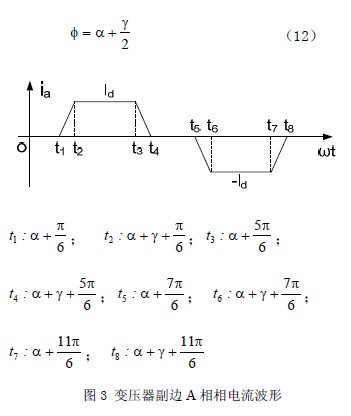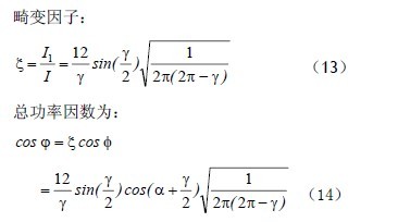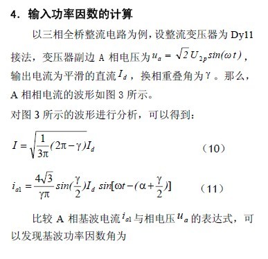 雖然公式(12)、(13)、(14)是從變壓器副邊的電流波形推導(dǎo)出來(lái)的,但如果不考慮變壓器的空載電流,變壓器本身并不會(huì)改變整流器的功率因數(shù)。所以,從變壓器的原邊來(lái)看,這三個(gè)公式依然正確。