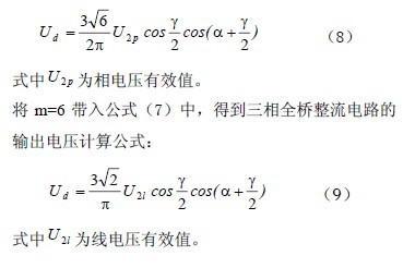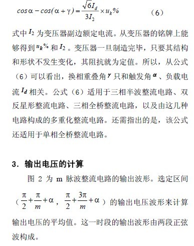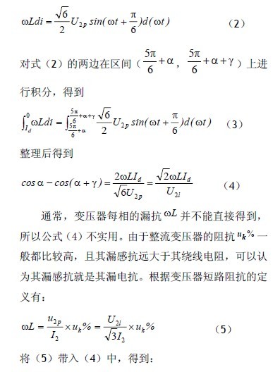通過(guò)詳細(xì)的理論分析,推導(dǎo)出了整流變壓器的阻抗與換相重疊角、輸出電壓、輸入功率因數(shù)的關(guān)系。這些公式具有普適性。較之公式(4),公式(6)具有更大的實(shí)用價(jià)值。這些公式對(duì)三相整流電路的設(shè)計(jì)具有較強(qiáng)的指導(dǎo)意義。
